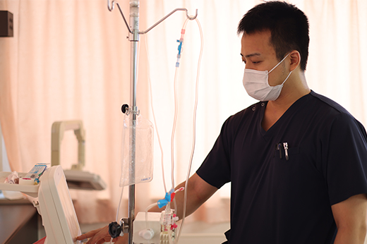 透析治療を行うためには、十分な血液を体外へ導く必要があるため、動脈と静脈をつなげた「シャント」と呼ばれる血管を使用します。このシャントを長く良い状態で保つため、定期的にPTA(経皮的血管形成術)を行い、血管の狭くなった部分をバルーンで拡張して血流を改善します。臨床工学技士は医師・看護師と連携し、安全で円滑な治療が行えるようサポートしています。また、治療計画の立案や使用物品の管理を行い、緊急時にも迅速に対応できる体制を整えています。