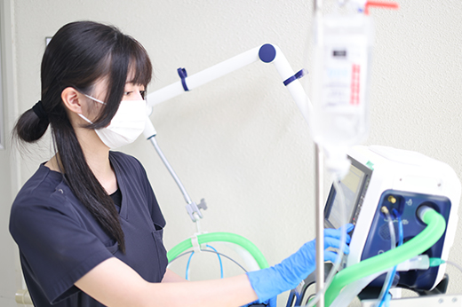 人工呼吸器は肺疾患や心不全など、何らかの原因で血液に酸素が取り込めない(呼吸不全)状態の患者様へ、ガス交換を改善すること、呼吸仕事量を減らすことを目的として使用されます。当院では、挿管用人工呼吸器、マスク用人工呼吸器(NPPV)、高流量鼻カニューレ酸素療法(ネーザルハイフロー)に対応しており、患者様に合わせた人工呼吸器を使用しております。装着後は1日2回(朝・夕)患者様の元へラウンドを行い、設定に変更はないか、実測値や患者様の状態に異常がないかを確認しています。また、安全に使用していただけるよう人工呼吸器のメンテナンス・管理等も行っています。