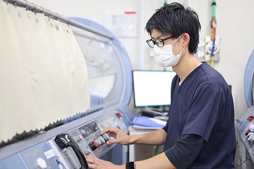 大気よりも高い気圧環境に入り、高濃度の酸素を吸入することで、血液中に溶けている酸素(溶解型酸素)が増え、減圧症、末梢循環不全、損傷組織の創傷不全、感染症等に対して有効な治療です。臨床工学課は2023年1月よりこの治療を開始することとなり、多くの患者様の一助となれるよう努めてまいります。