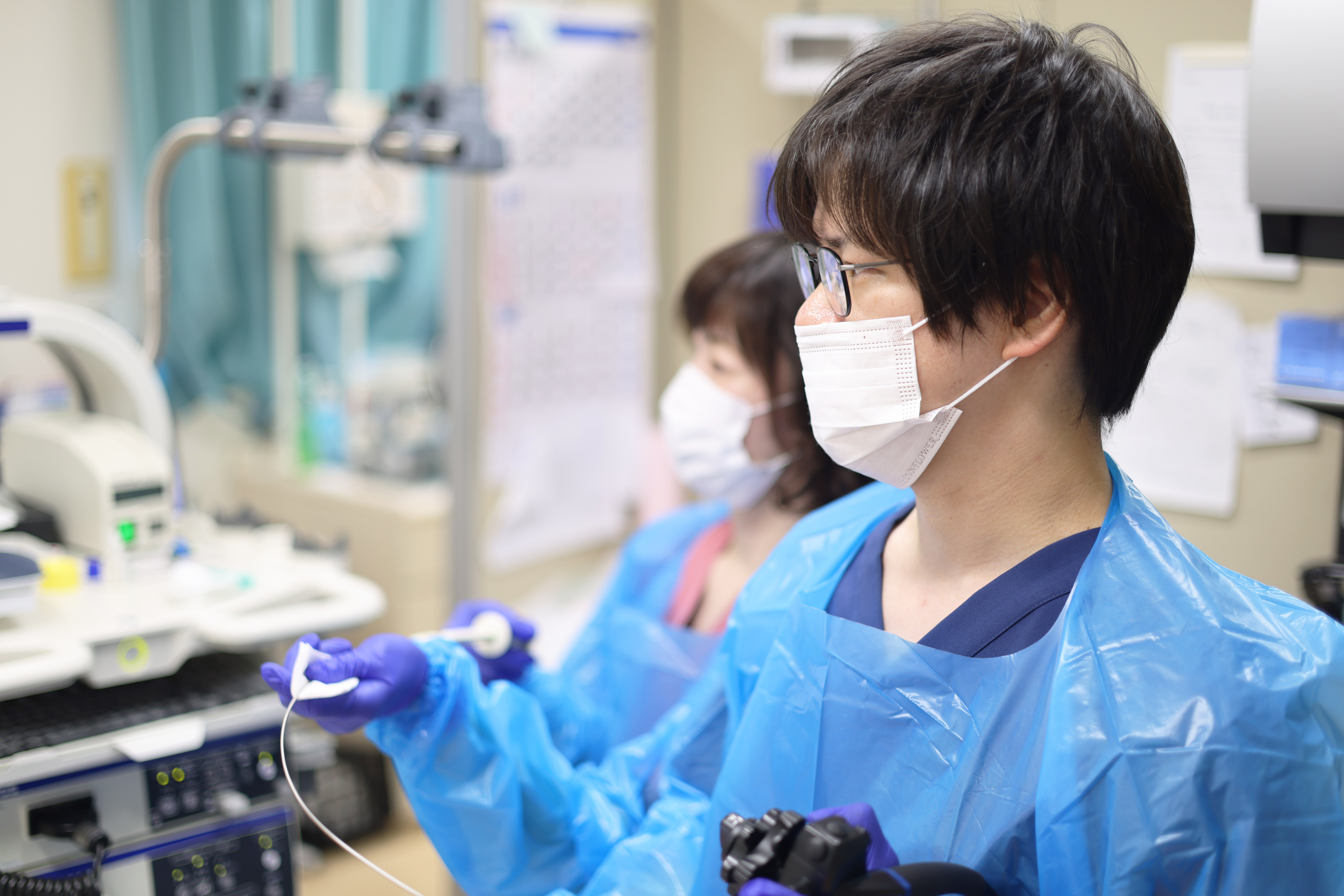 内視鏡業務は、2022年5月より臨床工学科の担当業務として開始しました。 上部・下部内視鏡、胆管内視鏡検査などの検査および処置において、看護師と連携しながら、医師が円滑に検査・処置を行えるようサポートしています。 また、患者さんをお待たせしないよう、次の検査準備を看護師と協力して効率的に進めています。さらに、内視鏡機器の始業・終業点検や洗浄業務も行い、安全で安心な検査環境の維持に努めています。