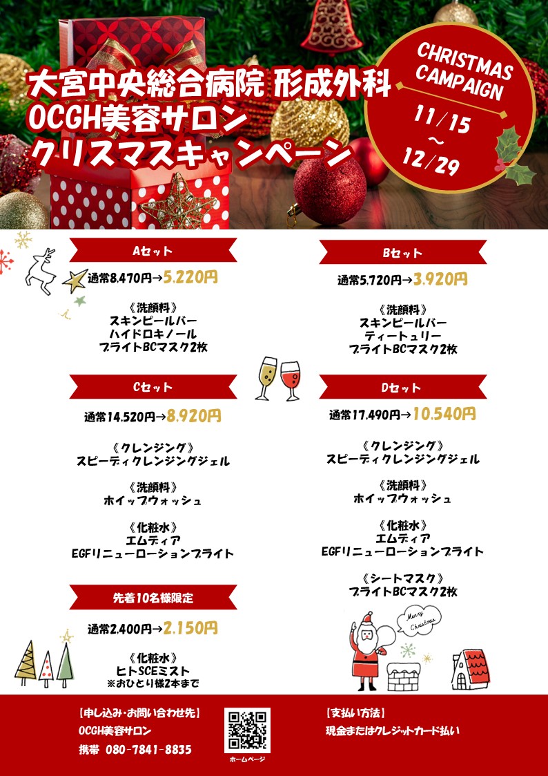 OCGH美容サロンクリスマスキャンペーンのご案内 2025 / 11 / 12 皆様へお知らせ OCGH美容サロンでは 11月15日(土)~12月29日(月)の期間、お得なクリスマスキャンペーンを開催いたします♪ 美容商品がお買い得になっておりますので、この機会に是非お試しください。 « 脱毛モニター募集のご案内