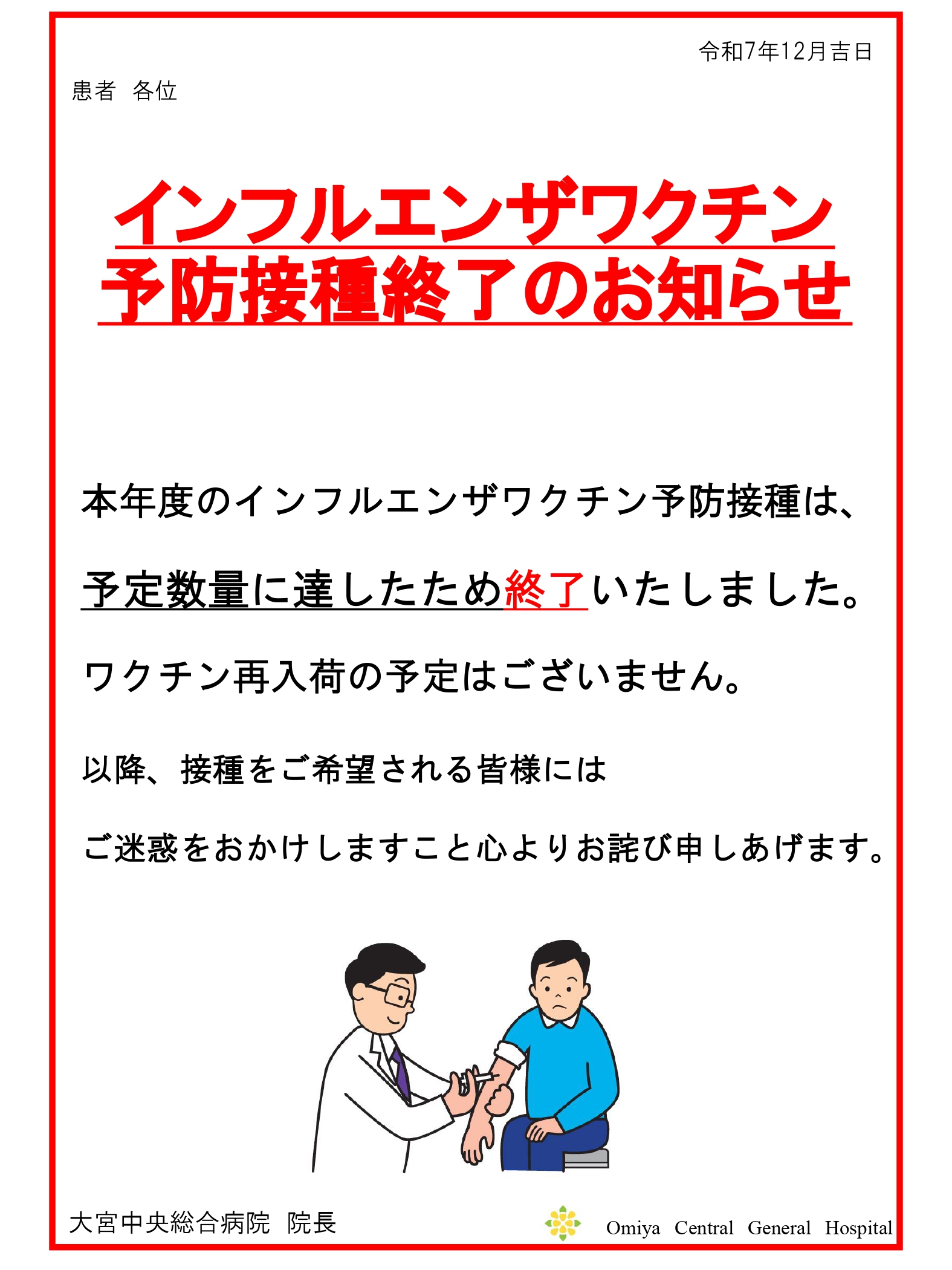 インフルエンザワクチン予防接種終了のお知らせ。