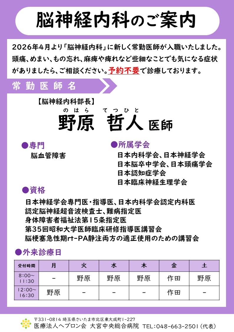 2026年4月より脳神経内科に常勤医医師が入職いたしました。